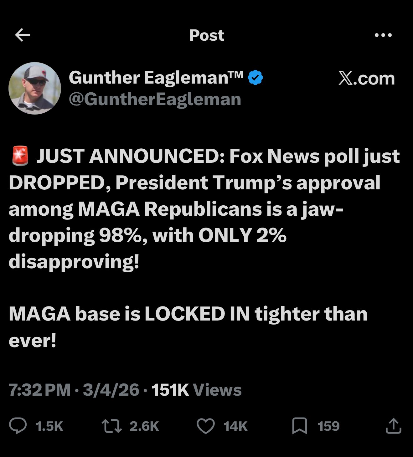 >>529954593>Literally every MAGA American supports Trump’s war on Iran.60% of republicans support it according to the last poll I saw. 10% democrats supported it. 98% is statistically just impossible.