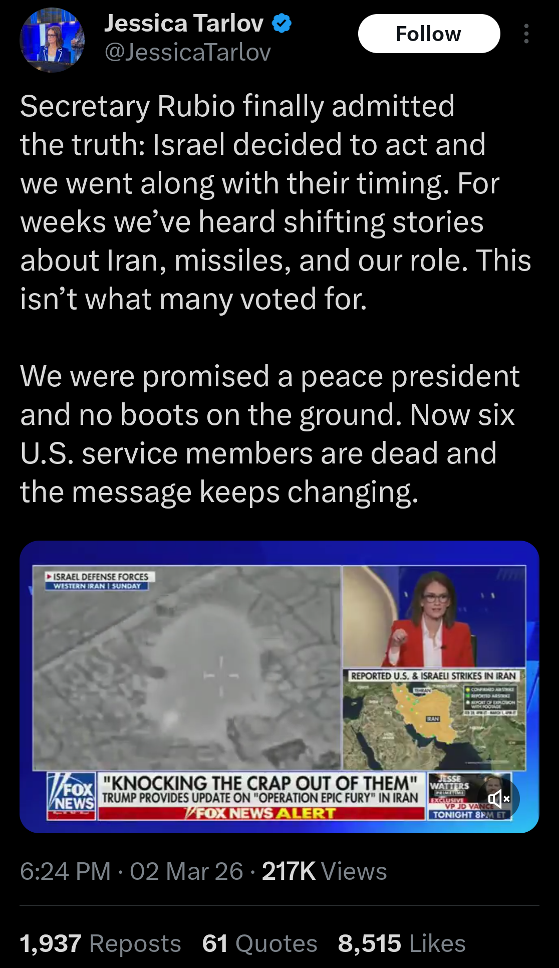 What frontline? We have 0 boots on the ground, crazy leftists want you to believe we're dying in droves but we aren't. We wiped out the entire Iranian military in a few days and are just doing cleanup work.