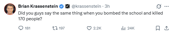>>529971206>logical to conclude this was yet another instance of a shitty Iranian missileNo niggerbrain, it was already admitted by the DOW, and they claimed they had bad intel but refused to apologize because all Iranians are targets. KILL MORE LITTLE GIRLS! MAGA