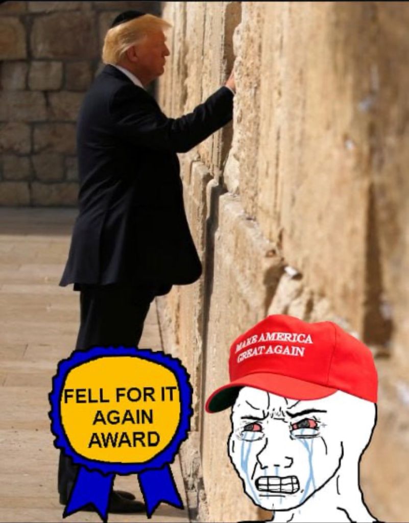 >>529971179Oh no! Trump put on a tiny hat and touched a wall! It totally means he’s a Jew puppet and everything he’s done is for Israel!Build the wallDeport illegalsExpose financial fraudExpose election fraudBust EpsteinBreak up pedo ringsWait… Trump did this all for Israel?!Who knew Israel is this based?!