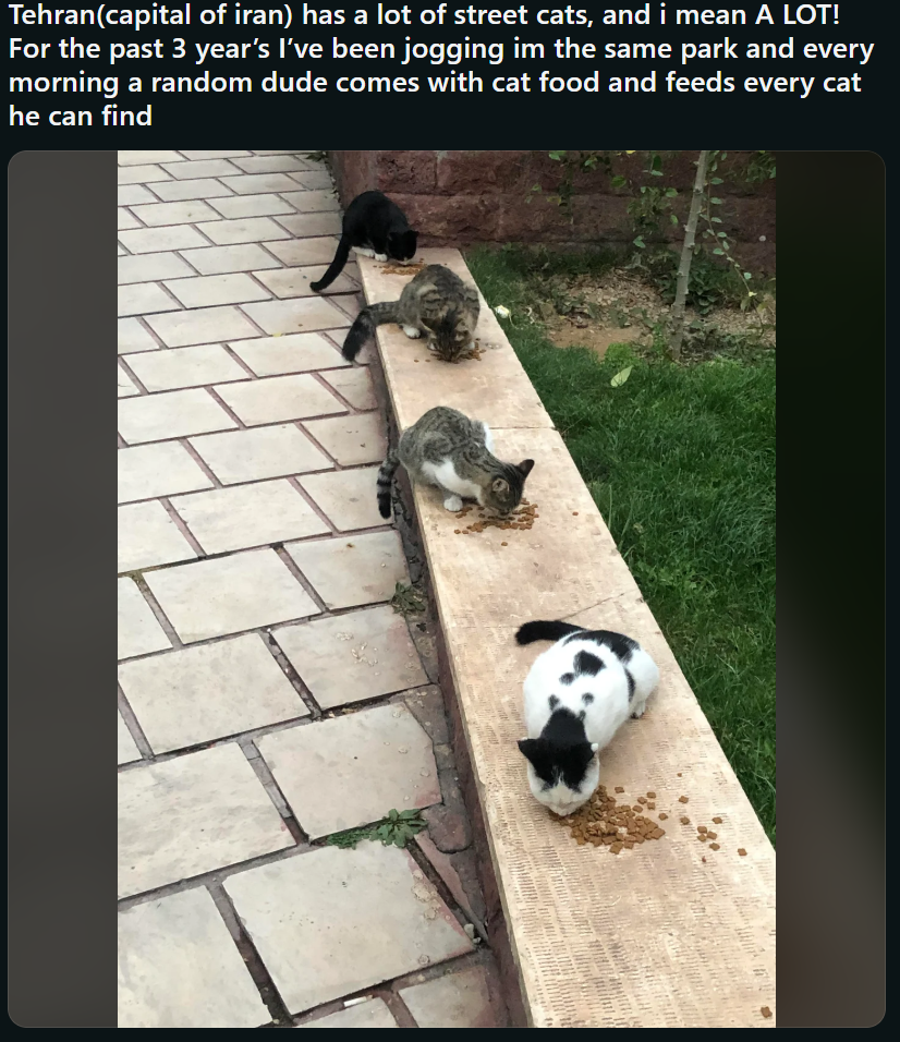 >Tehran (capital of Iran (this is the country being bombed right now by the evil israeli and american empires (we hate america and israel here (click the upvote button to show support)))) has a lot of street cats