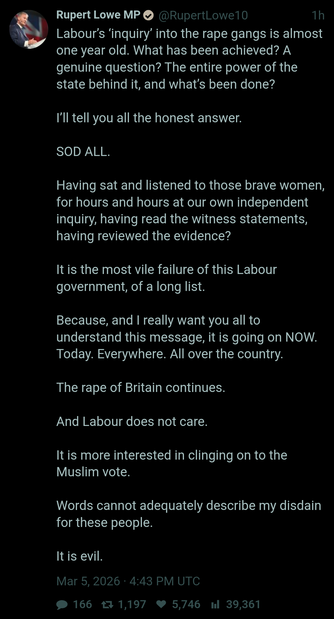 >>529975737This “I’m alright Jack” attitude is the same one Thatcherite Tory Rupert Lowe subscribes to. I’m also not the one voting for daft meme parties and then moaning when the left gets in on 25% of the vote. Restoremongs don’t understand electoral arithmetic.