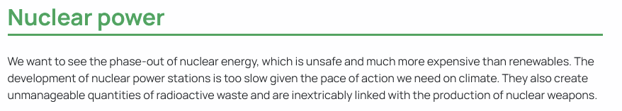 >>529972646Green Party policy is to abolish nuclear energy. https://greenparty.org.uk/about/our-manifesto/powering-up-fairer-greener-energy/