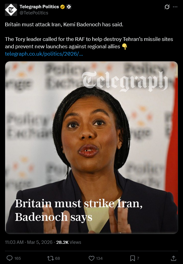 >Starmer says UK sending four fighter jets to Qatar and confirms first repatriation flight has taken offhttps://www.bbc.co.uk/news/live/c62gg44d53xt>Britannia's shame: Now Spain sends ship to protect Cyprus as island blasts 'weak' Britain, Royal Navy languishes in port and Iran drones hit top secret RAF basehttps://www.dailymail.co.uk/news/article-15616753/Britain-diminished-refusal-support-US-Iran-Starmer.html>Two boys who laughed as they took turns raping 'petrified' girl, 15, found guiltyhttps://www.express.co.uk/news/uk/2178680/boys-guilty-of-raping-girl>Protesters mourn Ayatollah at Manchester vigilhttps://archive.ph/69c4I>HSBC, Nationwide and Coventry raise rates on fixed mortgages amid Middle East crisishttps://www.theguardian.com/money/2026/mar/05/hsbc-coventry-raise-rates-fixed-mortgages-iran-middle-east-crisisBONUS>Globalisation is under threat from Iran war – and Britain is uniquely vulnerablehttps://www.theguardian.com/world/2026/mar/05/globalisation-under-threat-britain-economy-iran-conflict>Failed asylum seekers will be paid up to £40k to leave the UK, Shabana Mahmood announceshttps://www.independent.co.uk/news/uk/home-news/asylum-seekers-payments-hotels-40k-shabana-mahmood-immigration-b2932630.html>Starmer braces Britain for long war and stands by not joining Trump's airstrikeshttps://www.standard.co.uk/news/world/iran-war-latest-uk-rescue-flight-oman-middle-east-israel-tehran-trump-b1273554.html>Three men with links to Wales released on bail over alleged spying for Chinahttps://www.itv.com/news/wales/2026-03-05/three-men-with-links-to-wales-bailed-over-alleged-spying-for-china