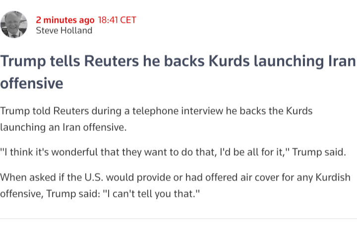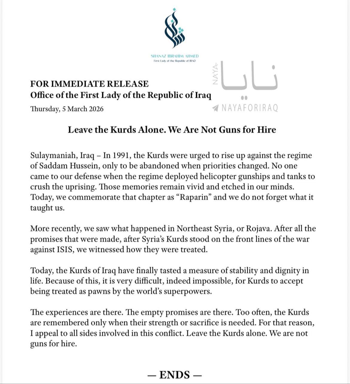 IRAQI KURDS REJECT TRUMP'S CALLThe wife of the Iraqi President and a leader in Jalal Talabani's party, Shanaaz Ibrahim, said:After what happened to us in Syria, we refuse to be used as pawns by global powers again.SHANAZ IBRAHIM AHMEDFirst Lady of the Republic ofFOR IMMEDIATE RELEASEOffice of the First Lady of the Republic of Iraq Thursday, 5 March 2026نايا00NAYAFORIRAQLeave the Kurds Alone. We Are Not Guns for HireSulaymaniah, Iraq - In 1991, the Kurds were urged to rise up against the regime of Saddam Hussein, only to be abandoned when priorities changed. No one came to our defense when the regime deployed helicopter gunships and tanks to crush the uprising. Those memories remain vivid and etched in our minds. Today, we commemorate that chapter as "Raparin" and we do not forget what it taught us.More recently, we saw what happened in Northeast Syria, or Rojava. After all the promises that were made, after Syria's Kurds stood on the front lines of the war against ISIS, we witnessed how they were treated.Today, the Kurds of Iraq have finally tasted a measure of stability and dignity in life. Because of this, it is very difficult, indeed impossible, for Kurds to accept being treated as pawns by the world's superpowers.The experiences are there. The empty promises are there. Too often, the Kurds are remembered only when their strength or sacrifice is needed. For that reason, I appeal to all sides involved in this conflict. Leave the Kurds alone. We are not guns for hire.