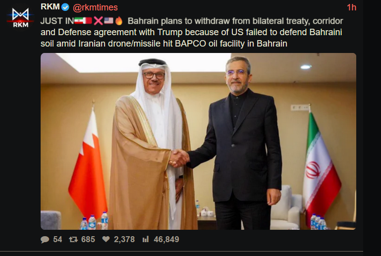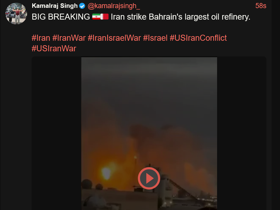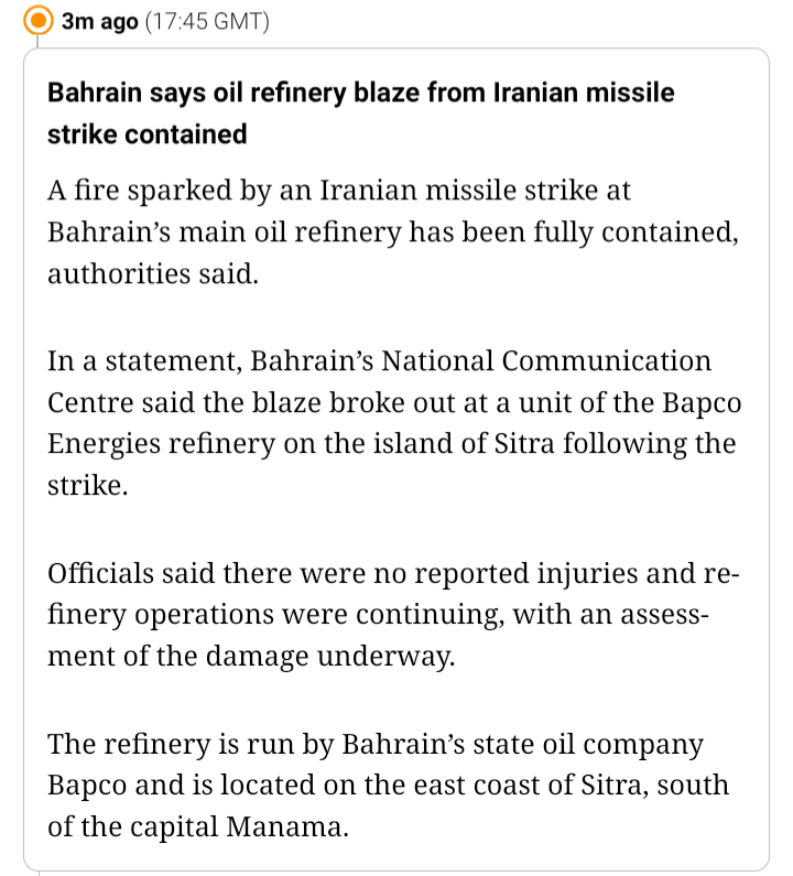 OP doesn't track that BAPCO got hit by an iranian missile which is the most consequence heavy event of today.Bahrain in response withdraws now hours later from cooperation and security partnership with the US.But you don't find it on pig because it is a low information israeli astroturf propaganda operation.Second most heavy thing the azerbaijan thing is covered up in the OP not mentioning that Iran hit Azerbaijans main civilian airport with a drone.Third most important thing is that Iran demonstrated today an unmanned underwater drone and attacked a ship with it in the strait of hormuz.If you did not learn about those three events you are in a propaganda bubble anon.