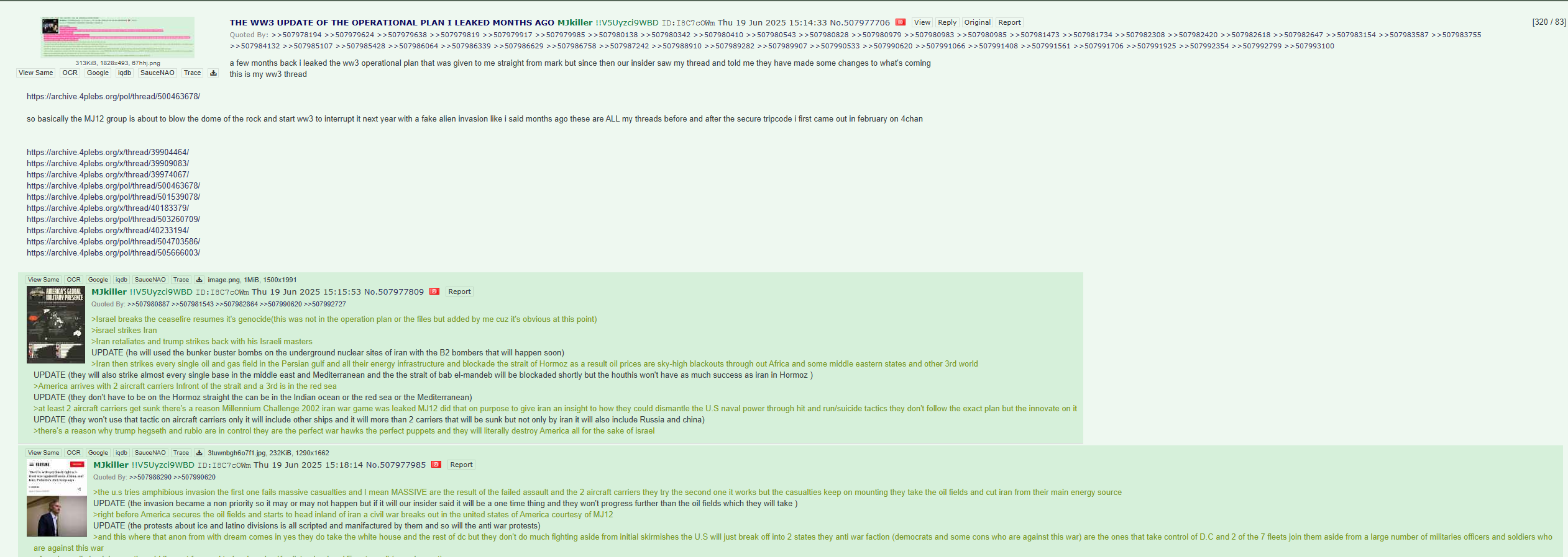 >>529973312Doubt it'll happen. Iran is a nothing burger, Trump just wants to force a regime change because he's on a power high after Venezuela, and even if he can't achieve that, we just need to keep blowing up their nuclear sites indefinitely whenever they pop up & that'll keep them in check. China has had multiple opportunities over the years to escalate things (assist Russia in their attack on Ukraine, invade Taiwan, and now assist Iran), but they seem pretty set on just sitting back & doing nothing (probably because they know their economy is a house of cards that will almost certainly come crashing down if they joined a real war)And Russia has shown what a joke they are with their war with UkraineAs for the rest of the world, they're probably pretty sick of Israel & the U.S. at this point so I doubt many will come running to help us & allow their soldiers to die for us, but they also wouldn't dare fight us so they'll just try to stay out of it.I just don't see it
