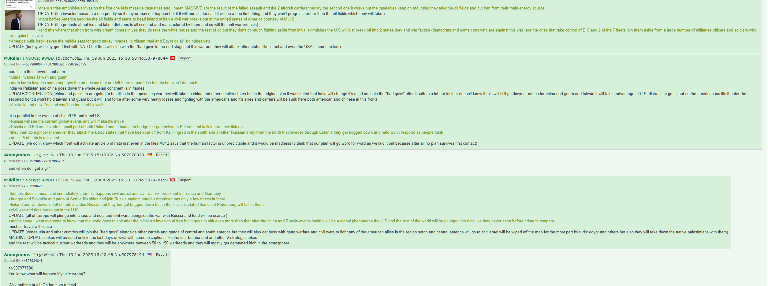 Guys, I am seriously scared that World War 3 is going to start soon. The countries of the world are so mad at each other. I don't want another World War. This could destroy my entire life! Please stop beating the drums of war!>In b4 "I have to join the military to afford food!"Fix the economy in your country before messing with someone else's country!>"We need to invade your country because your country is full of immigrants!"That's none of your business. Focus on your own immigration issues and I'll focus on mine!>"Your country is a human trafficking hub."A lot of Americans say this about Canada. Focus on the Epstein Files before making accusations aimed at my country pal.>"We need a war for Israel to make Jesus come back!"... but don't you want your country to survive for a century longer? Why do you want the world to end? People on this board constantly talk about how to make a country succeed and last, but how can you make a country last if you want the world to end?The world desperately needs de-escalation. I'm tired of all this tension between my country, America, Israel, Iran, Palestine and so forth. You don't want a nuclear war, do you?