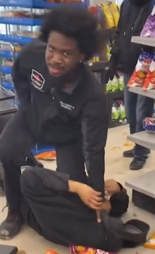 >guy is cowering on the ground totally under control and not a threat whatsoever >security guard keeps hitting him with brass knuckles yeah you can't do that