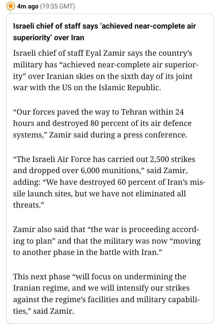 >Israeli chief of staff says ‘achieved near-complete air superiority’ over Iran