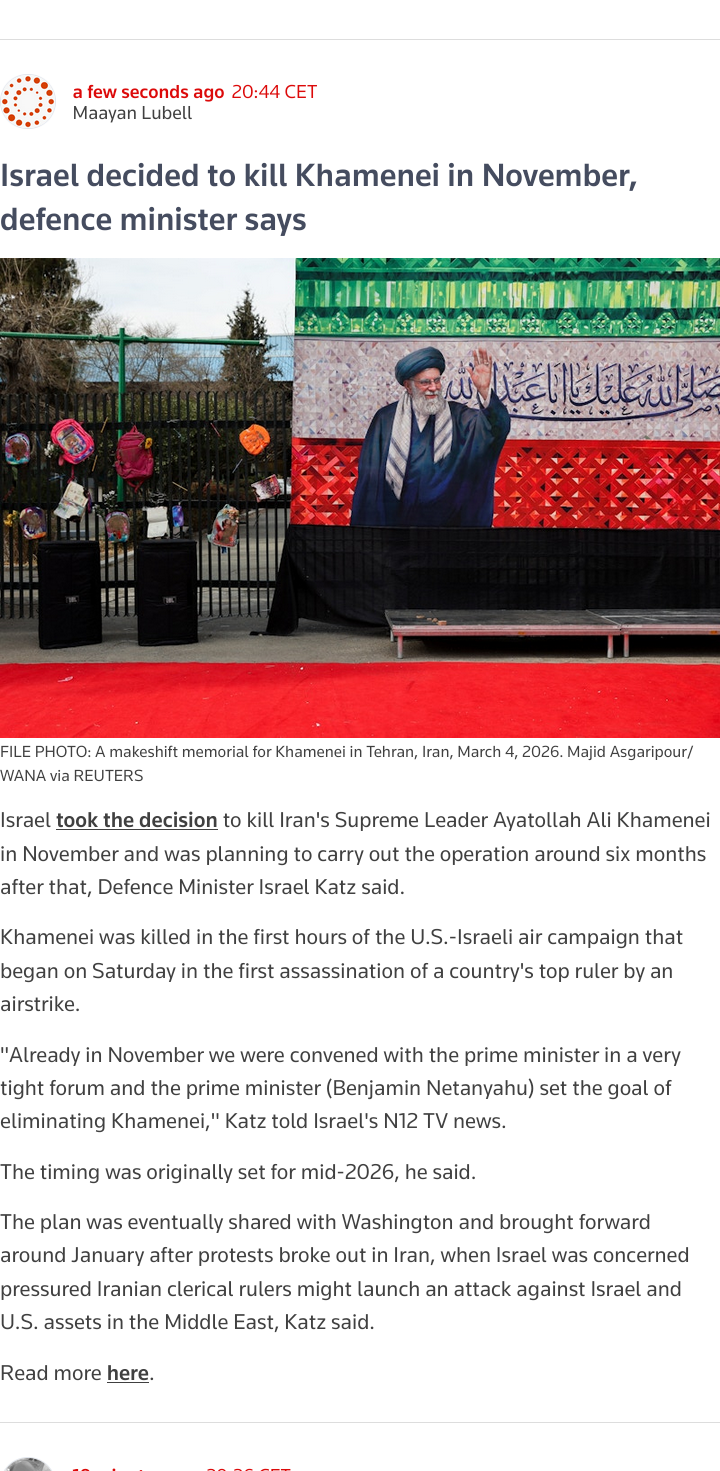 >Israel decided to kill Khamenei in November, minister sayshttps://www.reuters.com/world/middle-east/israel-decided-kill-khamenei-november-defence-minister-says-2026-03-05/