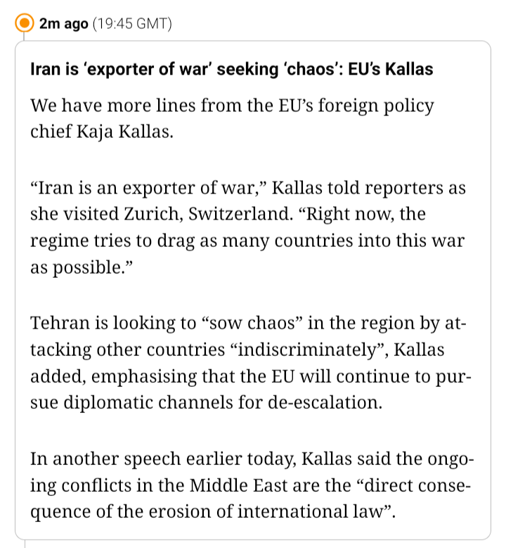 >Iran is ‘exporter of war’ seeking ‘chaos’: EU’s Kallas