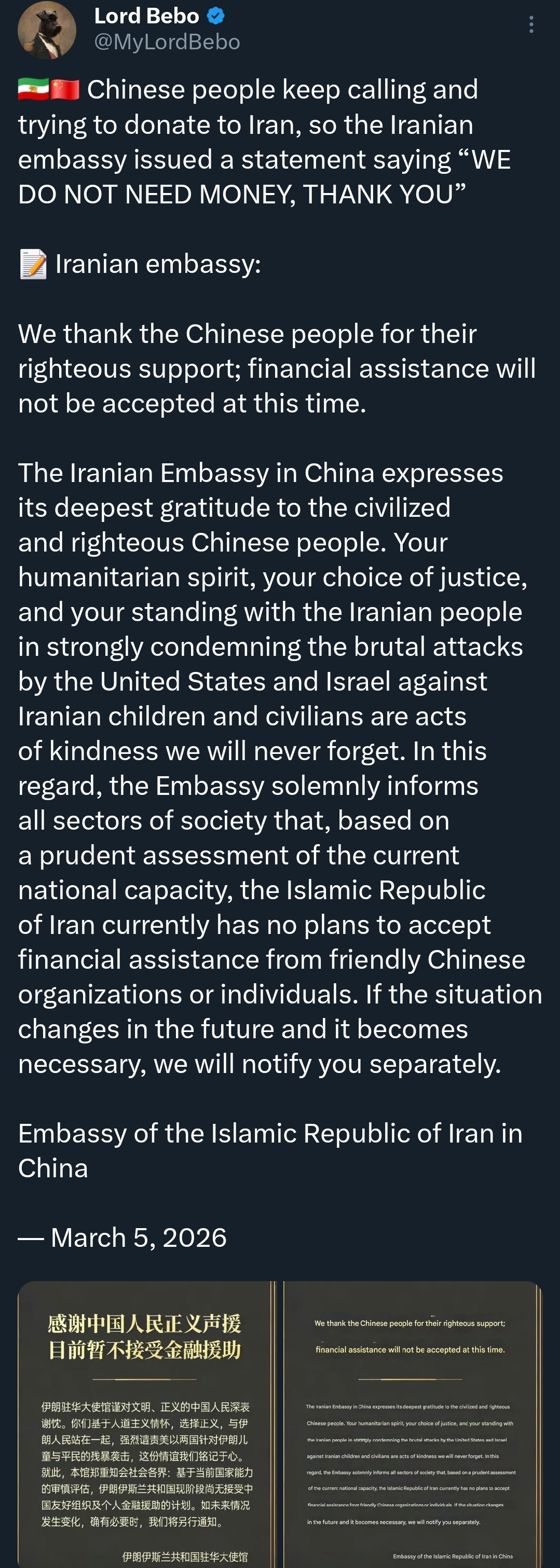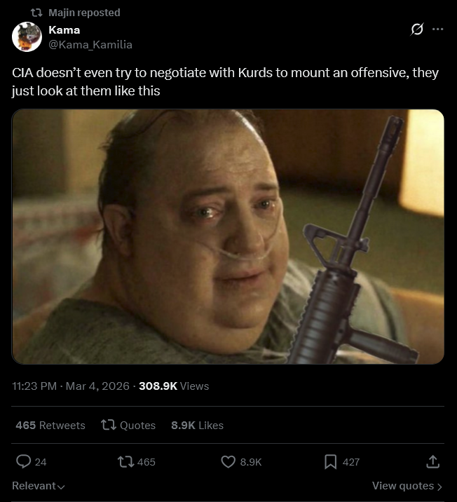 >>529983097What does "collapse" mean in this instance? Removal of US personnel? No US embassy? Tearing up US agreements? Switching sides? Language is vague >>529983339Fair enough, tiktok and Instagram gobbles this up so much I can barely avoid it.>>529983254While I understand that Iran also vow to destroy the energy and commercial sectors of US sympathetic nations. As a sovereign nation having your shit kicked in should elicit a retaliation.