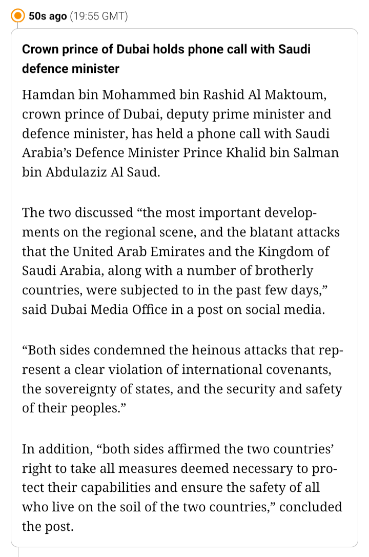 >Crown prince of Dubai holds phone call with Saudi defence minister