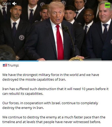 >We have the strongest military force in the world and we have destroyed the missile capabilities of Iran.>Iran has suffered such destruction that it will need 10 years before it can rebuild its capabilities.>Our forces, in cooperation with Israel, continue to completely destroy the enemy in Iran.>We continue to destroy the enemy at a much faster pace than the timeline and at levels that people have never witnessed before.kek hes already preparing the exit