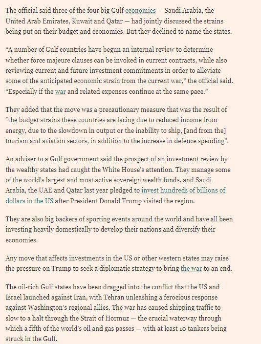 >Kuwait looks set to leave the US fold. The Saudis have pulled back their support. The UAE establishment is publicly asking questions of the United States. In less than a week, Iran has already created cracks in the US hold over the Middle East that has persisted for decades.