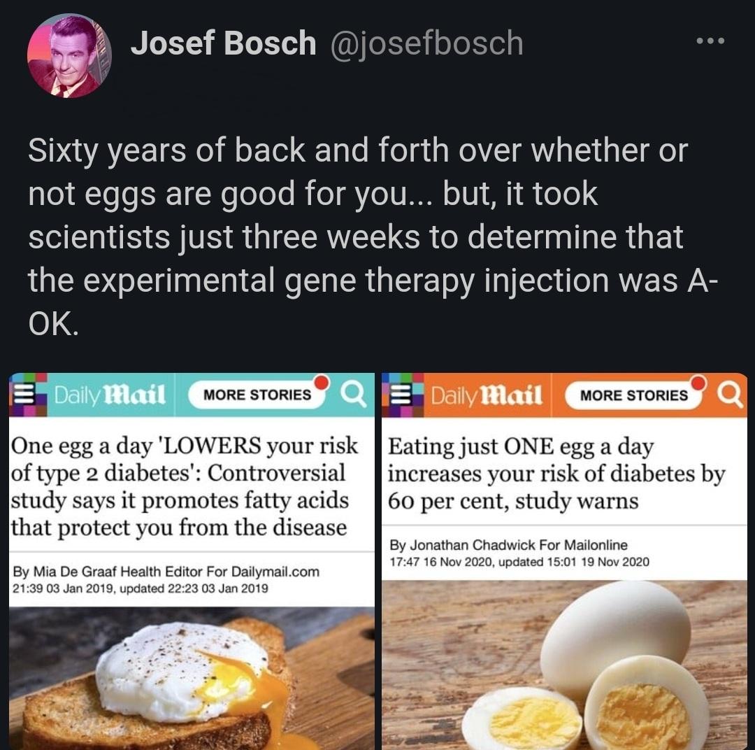 >>530011334>>530011533>>530011672I think this is a matter of looking at one variable at a time and treating it as an isolated thing. Eggs have an effect on this one variable, a negative one? EGGS BAD NOW. Wait, we looked a different variable and eggs seem to have a positive effect? EGGS GOOD NOW...Like they're just doing it one variable at a time and can't seem to just isolate it. We can't produce a human who does nothing but eat eggs for 5 years and study that human.