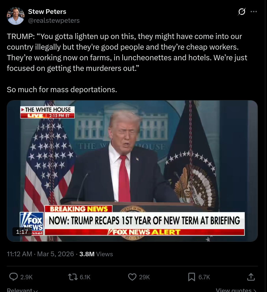 >>530014977>You gotta lighten up on this, they might have come into our country illegally but they're good people and they’re cheap workers. They’re working now on farms, in luncheonettes and hotels.Trump wants more brown peopleThey are cheap workers