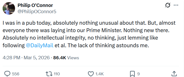 >https://www.dailymail.co.uk/news/article-15620605/Keir-Starmer-mercilessly-mocked-social-media-copying-Trump-embarrassing-TikTok-Iran-conflict.htmlStarmbots in No10 thought making a Trump-esque TikTok video with a Dire Straits sound track would somehow make them seem cool.Not cringe at all , no , not at all.>You get your money for nuthin>And your dicks for free