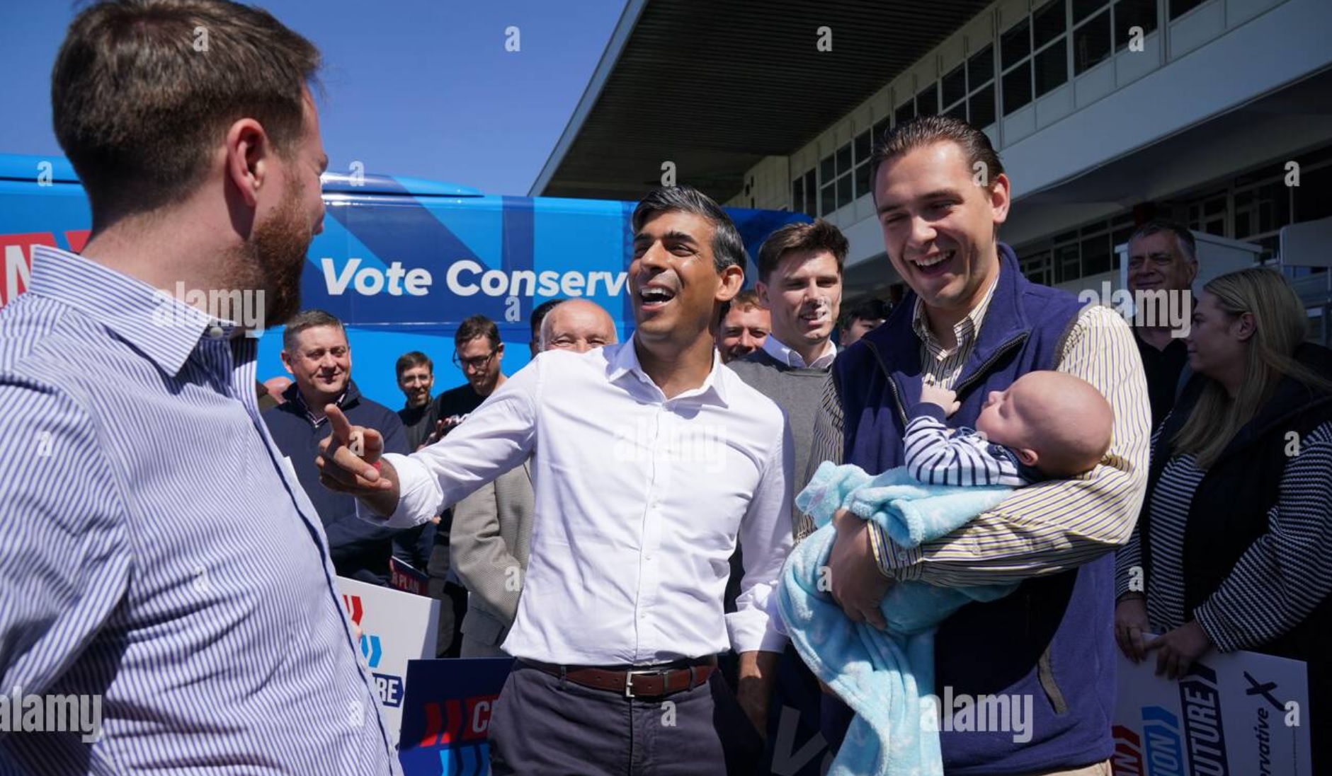 >Conservative candidate for Redcar & Cleveland Jacob Young (left) and Prime Minister Rishi Sunak (centre) meet Jack Symon and his son George at the launch of the Conservative campaign bus at Redcar Racecourse in the in the North East of England while on the General Election campaign trail. Picture date: Saturday June 1, 2024.