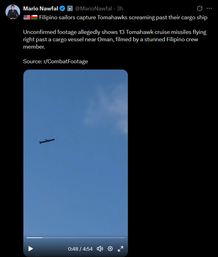 Filipino sailors supposedly capture multiple cruise missiles being fired on camerahttps://x.com/MarioNawfal/status/2029778429927649464
