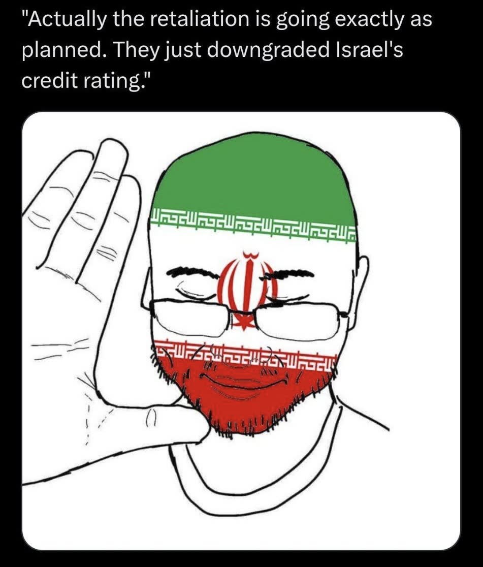 >>530027333>Supreme leader gone>Significant amount of government gone>Navy gone>Air force hiding to not end up like the navy>Insufficient industry that is getting bombed to smitherines>Diplomatically isolated to such a degree that not even China is bothering to help them>All the neighbours to the west and south are either already at war with them or considering joining in>But actually Iran is winning because they bombed some US bases (that's apparently where the whole US army is stationed) and none of their territory is directly occupied