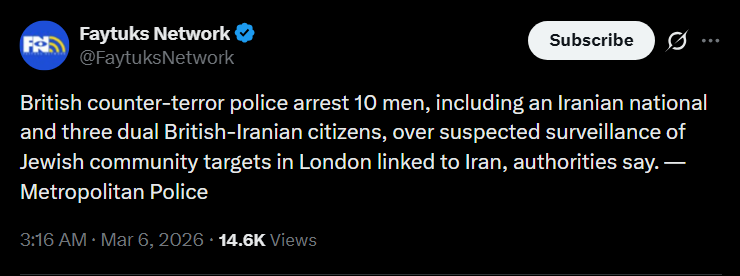 >British counter-terror police arrest 10 men, including an Iranian national and three dual British-Iranian citizens, over suspected surveillance of Jewish community targets in London linked to Iran, authorities say. — Metropolitan Police