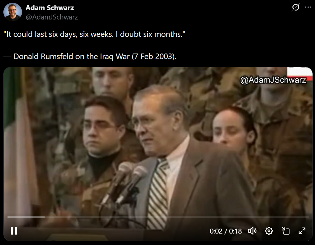 >>530027599>kill supreme leader>4 hour operation boys we will be home before lunch time>dont worry they will surrender >overseas bases get hit, radars and expensive equipment destroyed>okay 48hr operation, we will show them how stronk we are>Rubio goes on record to news outlets that Israel was going to strike first so we had to join to avoid retaliation >okay 4-5 day operation boys we have wiped out 90% of their launchers>why wont UK help us?>why are Spain not helping us?>nooooo Rubio mispoke stop quoting him>4-5 week operation boys we have dominated their airspace and eliminated nearly all of their launchers>hello South Korea we need those AD launchers back>Kurds can you help please?>why is the Saudi gov publicly calling us out? >okay operations will go on until September but we have wiped out 64% of their launchers and we will get air supremacy soonIs that winning?