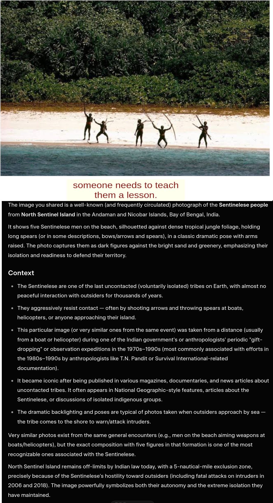 >>530040462My uncle works in the Indian secret service. India uses that island as a secret bunker where they experiment with chemical/biological weapons. The sentinalese are just sudanese mercenaries larping as island natives.