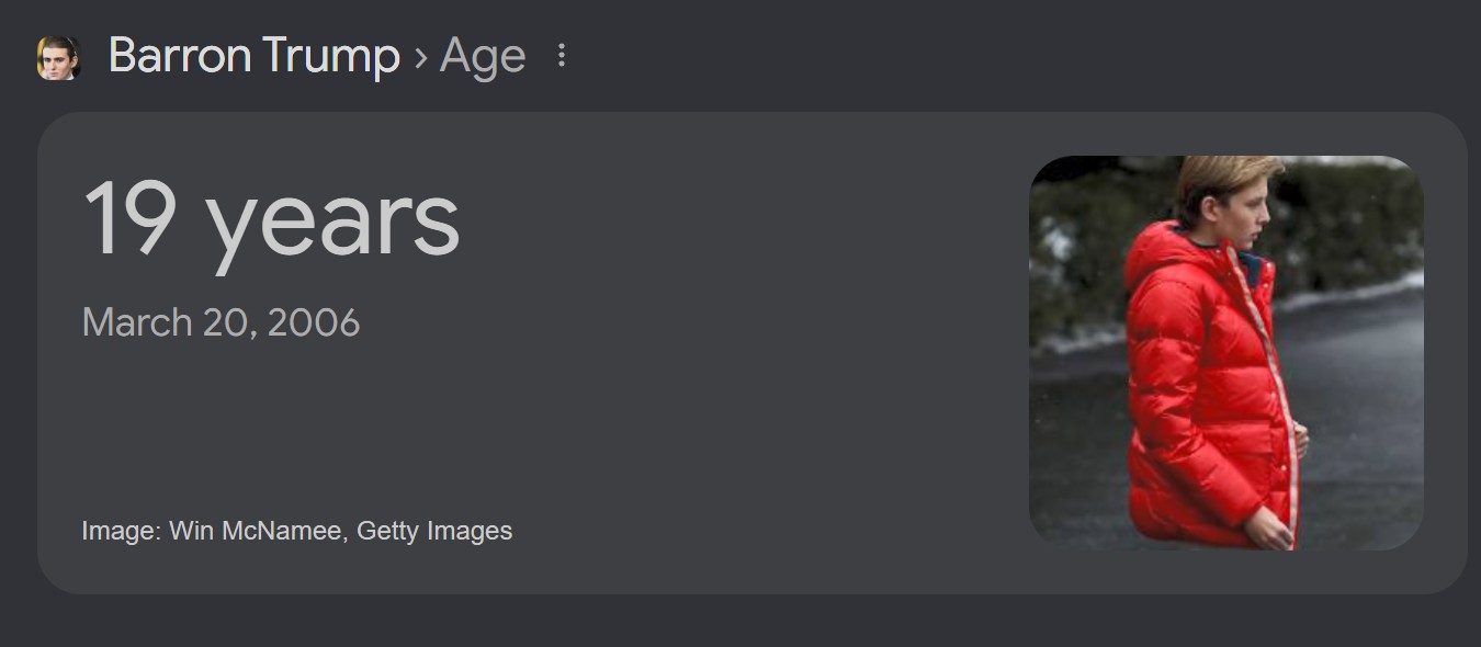 >Quite literally 2006So when does Baron head down to the recruiter? 19 and still at home!? He needs to get a life...what kind of man sits at home on dads money? Ill tell ya, Hunter Biden, Nick Reiner, etc.