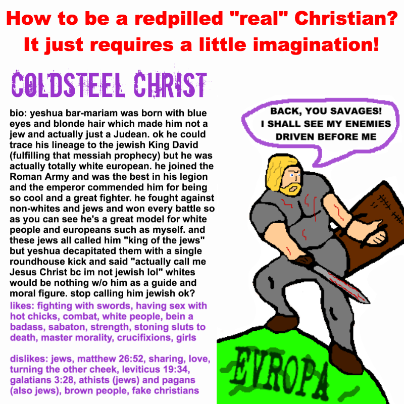 I don’t know why /pol/ mutts just can’t take like a single day out of their shitty lives to get to the bottom of it. Jesus was a Jew, and he came to earth saying that the kingdom promised is a heavenly one, and it’s for all people. The other Jews killed him because they wanted to be above the rest of humanity, and have an earthly kingdom. It’s not that fucking hard to understand. With that said, you would be retarded to be a Judeo Christian.