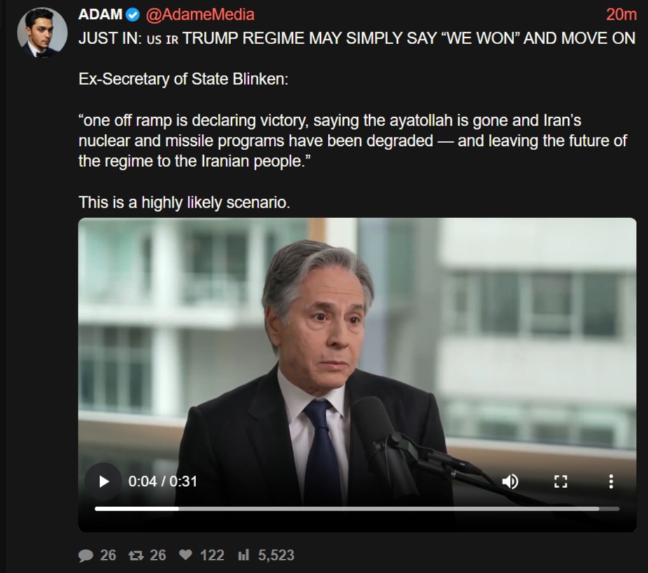 JUST IN: TRUMP REGIME MAY SIMPLY SAY “WE WON” AND MOVE ONEx-Secretary of State Blinken: “one off ramp is declaring victory, saying the ayatollah is gone and Iran’s nuclear and missile programs have been degraded — and leaving the future of the regime to the Iranian people.”This is a highly likely scenario.
