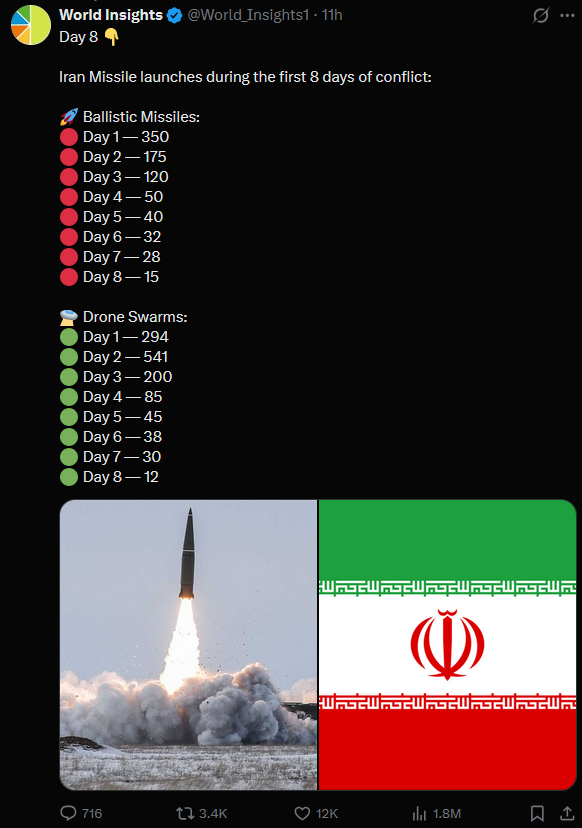 >>530052922RECAP ▶Week: 1>Iran's ballistic missile attacks have declined by 90% since the first day of the war - Pentagon>30 Iranian warships and a submarine has been sunk in the Gulf of Oman — CENTCOM>Kurdish forces in Iraq are in talks with the U.S. for a ground military offensive into Iran>Hezbollah joins the war, Israel launches ground invasion of Lebanon and orders evacuation of towns south of the Litani river>Traffic through the Strait of Hormuz is suspended>Iran launches ballistic missiles & drones at: Israel, Saudi Arabia, UAE, Qatar, Kuwait, Bahrain, Oman, Jordan, Iraqi Kurdistan, Cyprus, Turkey and Azerbaijan>Iran's Supreme Leader Ayatollah Ali Khamenei is killed>U.S. & Israel launch a joint regime change operation against Iran, dubbed "Epic Fury"; also targeting Iran-backed militias in Iraq