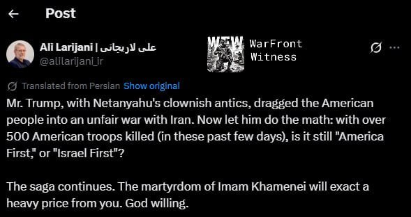 >>530059653RECAP ▶Week: 1>Iran's ballistic missile attacks have declined by 90% since the first day of the war - Pentagon>30 Iranian warships and a submarine has been sunk in the Gulf of Oman — CENTCOM>Kurdish forces in Iraq are in talks with the U.S. for a ground military offensive into Iran>Hezbollah joins the war, Israel launches ground invasion of Lebanon and orders evacuation of towns south of the Litani river>Traffic through the Strait of Hormuz is suspended>Iran launches ballistic missiles & drones at: Israel, Saudi Arabia, UAE, Qatar, Kuwait, Bahrain, Oman, Jordan, Iraqi Kurdistan, Cyprus, Turkey and Azerbaijan>Iran's Supreme Leader Ayatollah Ali Khamenei is killed>U.S. & Israel launch a joint regime change operation against Iran, dubbed "Epic Fury"; also targeting Iran-backed militias in Iraq