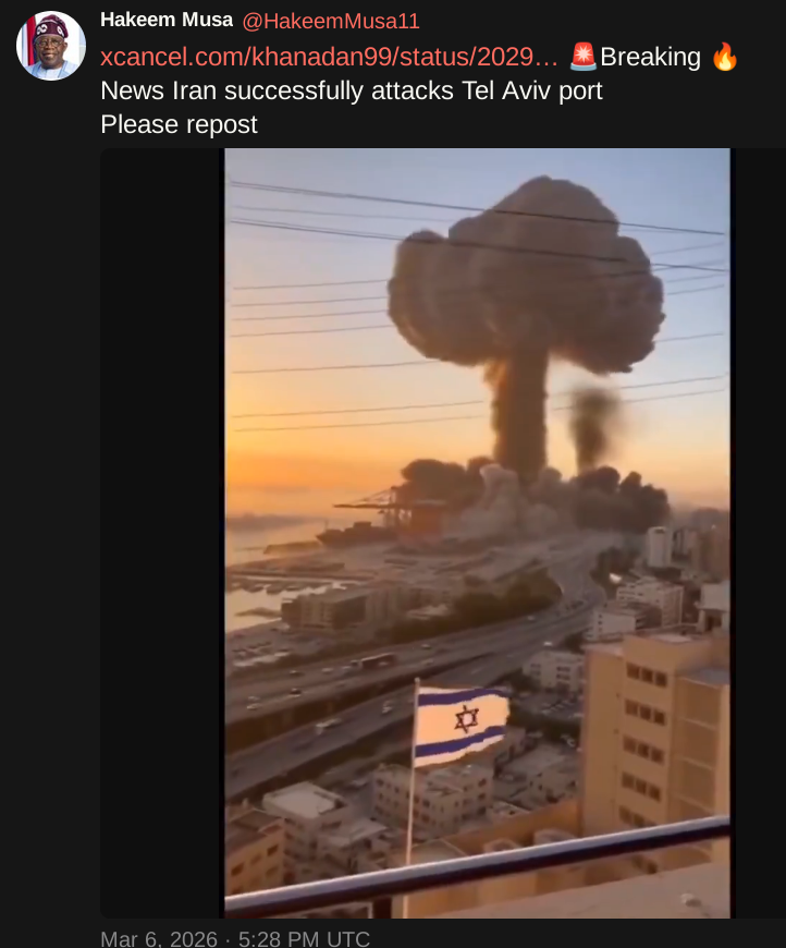 >>530060531It's real anon, Tel Aviv port was nuked but you can't read of find more information about it anywhere in the world because there's an internet blackout and complete shutdown of communications, the only person who knows the truth is this twitter post. Trust.