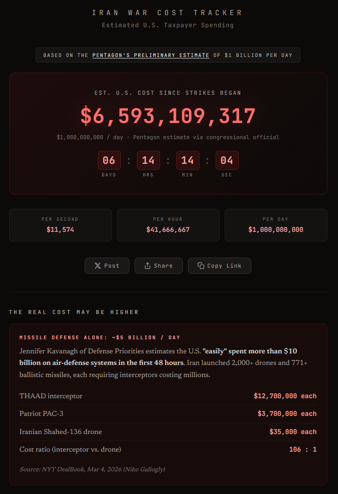 Previous: >>530059653Timeline▶Day: 7>US intelligence suggests that China may be preparing to provide Iran with financial support, spare parts, and missiles components - CNN>Crude oil futures climb >$92 a barrel>Trump says: "There will be no deal with Iran except unconditional surrender!">Russia is sharing intelligence with Iran to assist in targeting U.S. forces - WaPo>Qatar's energy minister warns oil prices could rise to $150 within two weeks>Azerbaijan is withdrawing diplomats from Iran, closing its embassy in Tehran, and raising the readiness of its military forces>Editor-in-Chief of The War Zone (TWZ) Tyler Rogoway says the U.S. and Israel have not achieved full air supremacy over Iran, despite claims>Major Gulf economies — including Saudi Arabia, the UAE, Qatar, and Kuwait — are reviewing overseas investments as the Iran war strains their finances>UAE is considering freezing billions of dollars in Iranian assets held in the country, and may also seize Iranian ships – WSJ>U.S. strategic bombers arrived in Diego Garcia, massive uptick in bomber sortie rates coming soon▶Livestreamshttps://www.youtube.com/watch?v=4E-iFtUM2kkhttps://www.youtube.com/watch?v=JHwwZRH2wz8▶Telegramhttps://rentry.org/tgnews▶Twitter accounts (using proxy frontend because twitter's UI is trash):https://nitter.net/clashreporthttps://nitter.net/FaytuksNetworkhttps://nitter.net/sentdefender▶Israel Rocket Alertshttps://www.tzevaadom.co.il/en/▶Air Traffichttps://www.flightradar24.com/https://flightaware.com/livehttps://globe.adsbexchange.com▶Maritime Traffichttps://www.marinetraffic.com/https://www.vesselfinder.com/Note: /pig/ is the only general for this event. Do not split it into dueling generals like /uhg/ and /chug/ or turn it into a support thread for either side.