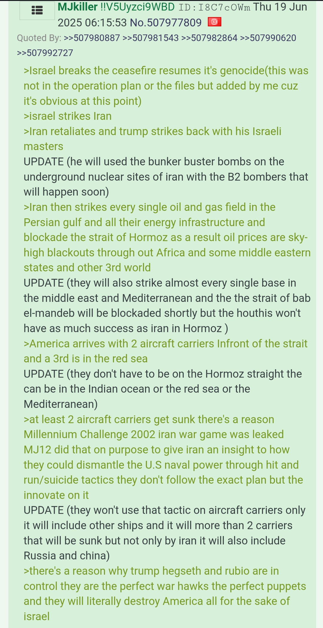 >>530073337I see what you mean, I agree we should not be influenced to either side and that idea ought to be spread. Iran and Israel are both unsavoury nations, but Iran never tried to make my country gay af, however we should criticise both sides in any rhetoric, and reject taking a side. Iran has a right to defend itself. Israel/America should fight this war by themselves if they are the ones who started it.But I don't think such reasonable attitudes will prevail.