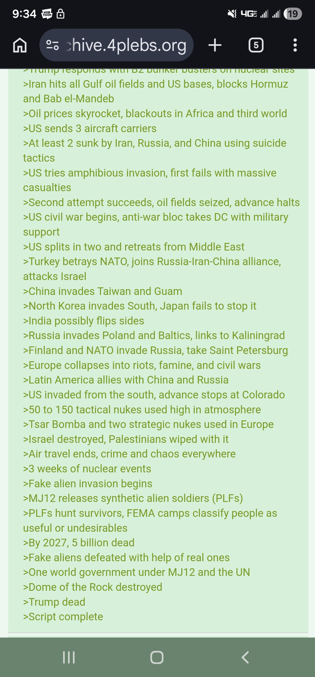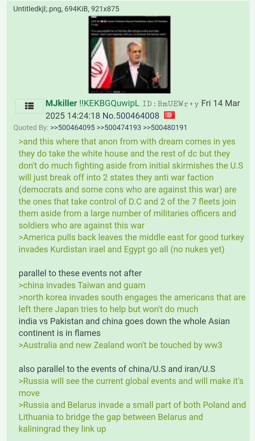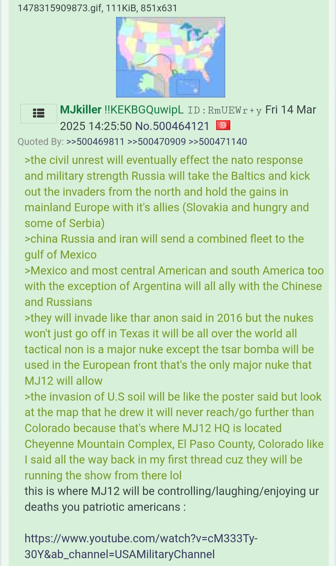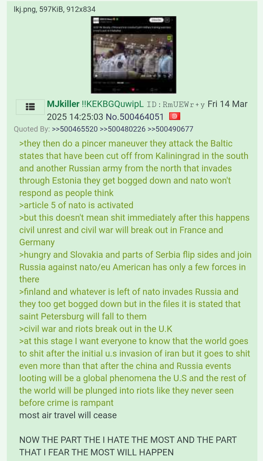>>530063408>Russian army from the north invadesThe text became utter bullshit at that point.Russians can barely handle a war against a single country with completely flat geography. War on multiple fronts would be a disaster.They're not a conventional military might by any means imaginable and won't be able to go on some genocidal crusade.Russia would collapse in a civil war if they tried that. They'd have to start drafting from the bigger cities and those places are basically Westernized at this point and won't tolerate being sent to die in a war.