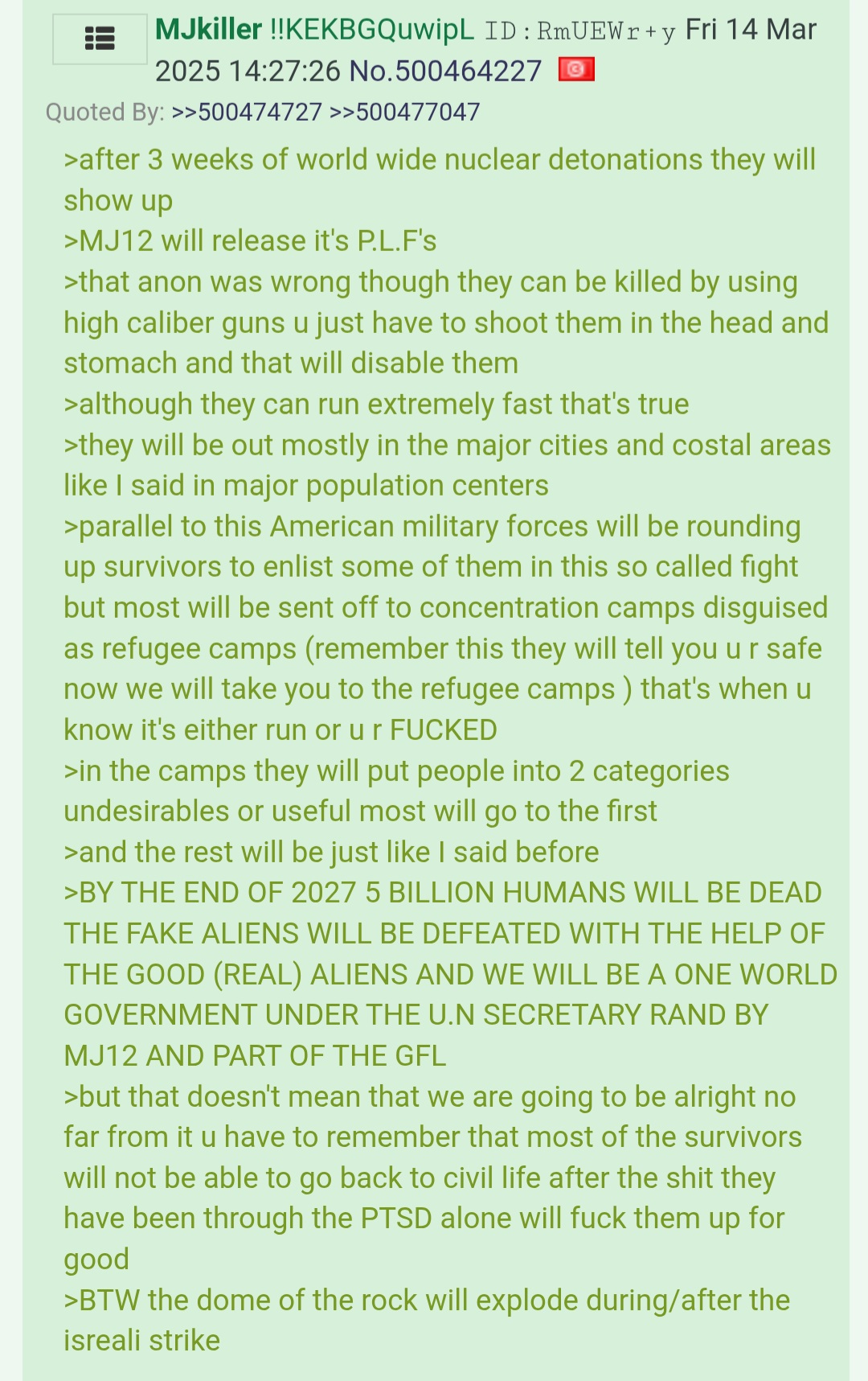 >>530073848I don't think so, these locusts are literally from Hell, another dimension?, not from Earth, which is where the PLFs are created by these evil MJ12 types. They are likely genetic abominations/chimeras, robots or some combination. The locusts of Revelation are unleashed to be used as punishment for the people who have taken the Mark of the Beast.These PLFs are likely a component of the strong delusion, along with the fake alien invasion, and later, this "Galactic Federation of Light" are actually demons, masquerading as extraterrestrials evolved on another world.