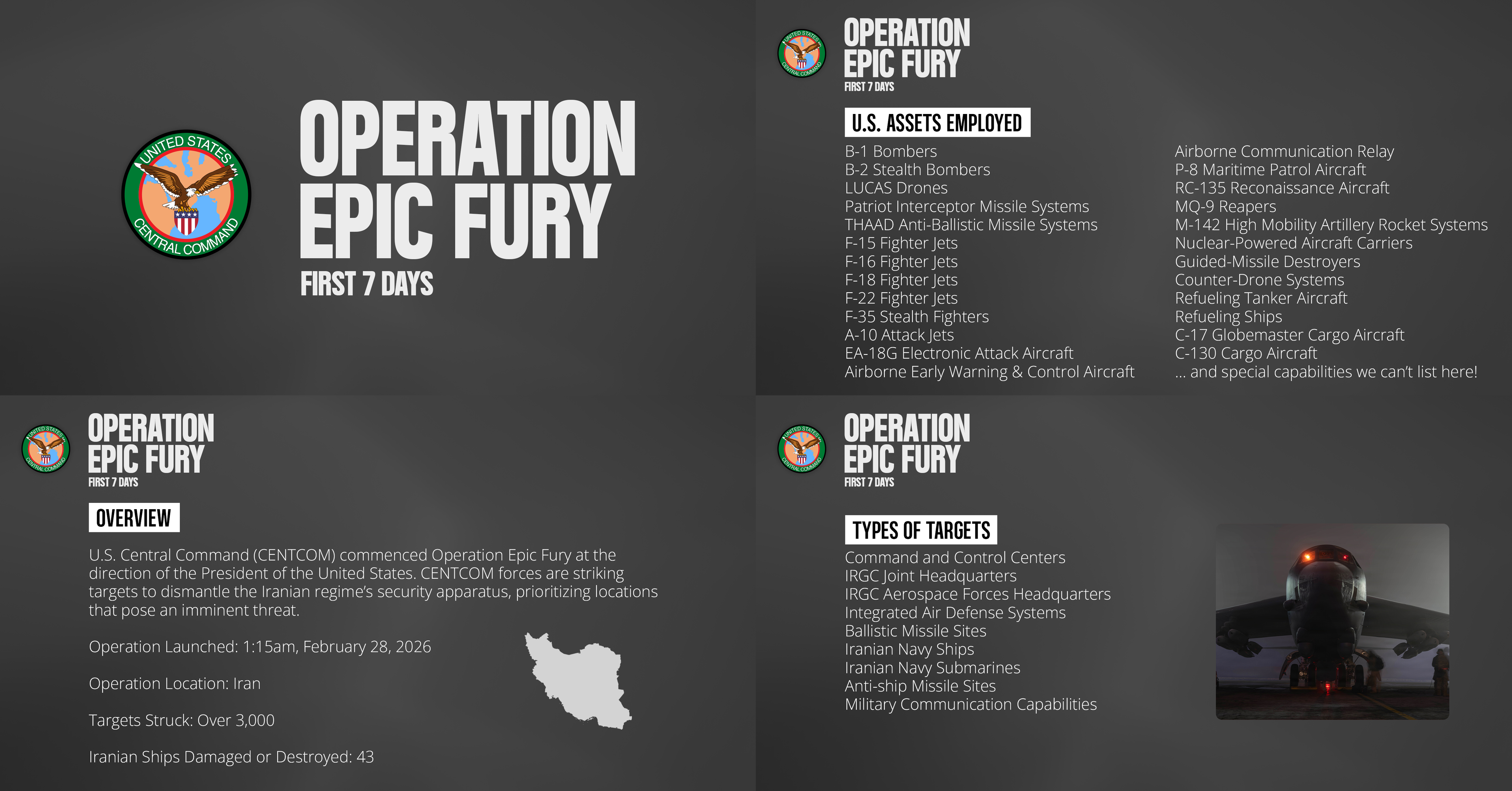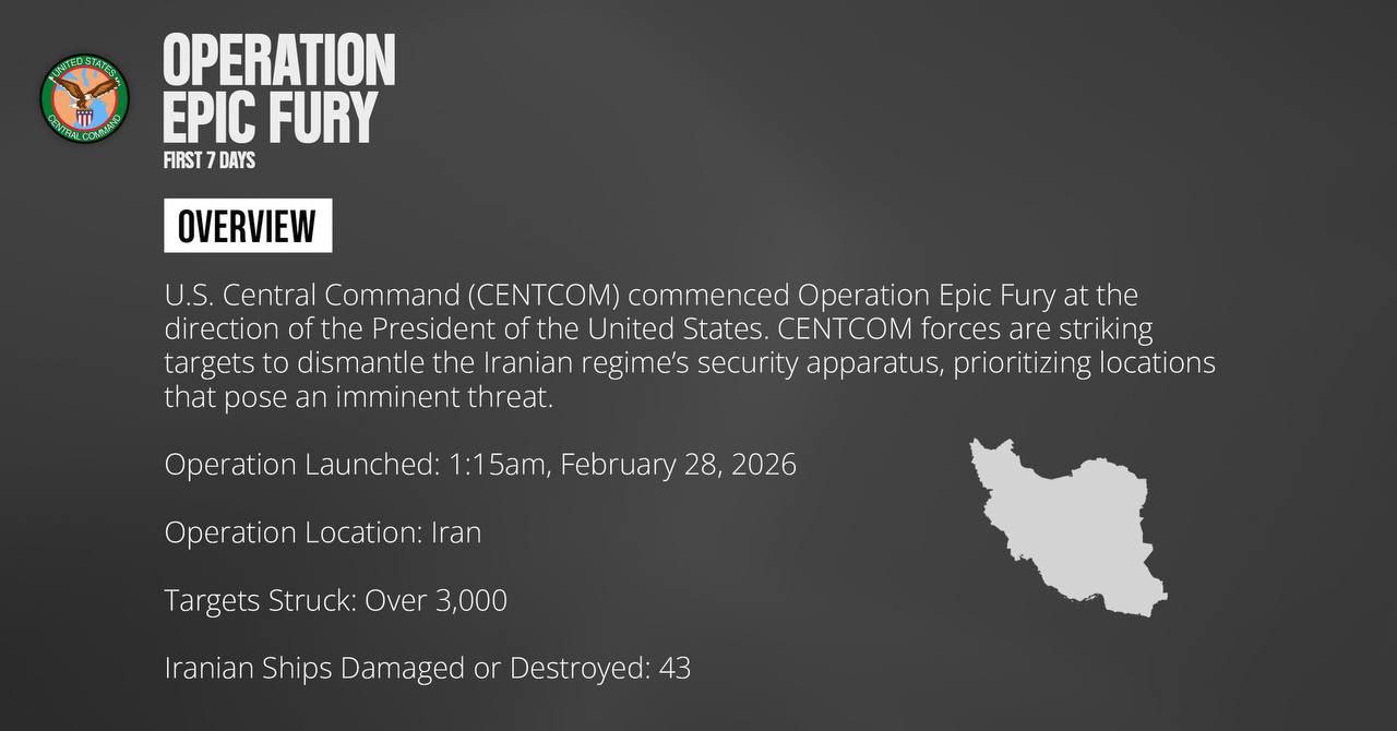 US Central Command:More than 3,000 targets have been attacked in Iran so far. 43 Iranian Navy ships have been attacked/sunk