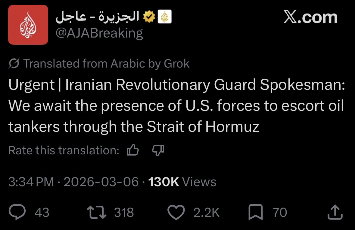 Also worth mentioning - hilarious how people are now spinning the "well hopefully he'll just give up and leave!" No. Iran is now at war with the gulf states. The US burned through our interceptor stockpiles. We took fucking defensive tools from South Korea. Now our ability to justify bases and trade deals is dying when people think "oh they might just take all this back at the drop of a hat". The fucking strait is closed and Iran will never let US ships through again. Israel and Saudi are now in it for the long game. Do you donkeys really think it is over just because trump will try to turn tail?
