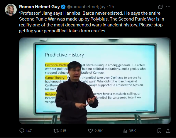 He thinks the Second Punic war was a conspiracy theoryAbsolute West hating CCP Wumao.Attacking America is one thing but digging up ancient European history and calling it a conspiracy because you hate the West that much?Nuke chyna and be done with it