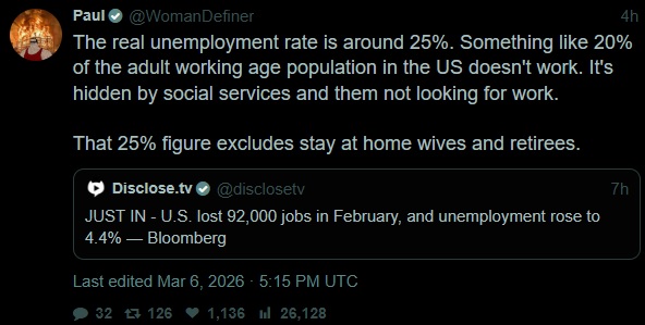 I like my #s so I'm always looking them up. I wasn't able to calculate for neets but 131 million people filed a W-2 last year. Divide that by 50 states you get 2.6 million per state average. I'm Floridian we have 67 counties that's 40,000 jobs per county. Florida is the third largest state and I live in the most densely populated county we had over a million people during COVID but it's much less now as most new residents bailed because Florida wages are kinda low relatively to how urbanized we are and cost of living. So I would expect when have more than our fair share of jobs here 400k/1m=actual employment at 40% retired is 250k so we have been default 350k unemployed or 35% in an area that statistically must be beating the national average. His estimate of real unemployment, people who are not working not looking for work and not receiving govt benefits or retired is quite conservative. Only 20% of households are net taxpaying that would be the number of w-2s filed as head of household where the net income of everyone working in the household is 80k or more.