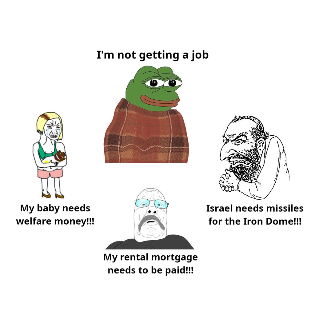 >try to get fast food or warehouse job>can't because foreigners take priority>try to get white collar job>can't because oversaturated; jeets and diversity hires take priority until AI gets rid of most of them>try to get blue collar job>can't because boomers gatekeep apprenticeships>try to start my own business>you need a permission slip for every single little thing>fine I'll just join the military>have to kill random people halfway around the world for IsraelInb4 some neurotypical normie responds "Ha I got a high paying WFH job from a referral by my friend from college, just try harder bro!"