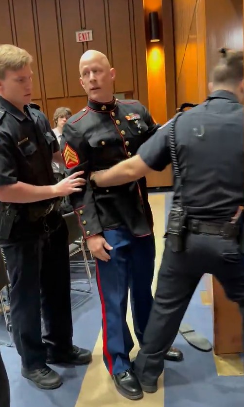 How did his hand get stuck in the door? When he breaks his arm and they're trying to escort him out, they can't get his arm and hand out of the door. You can tell he is in pain and just wants to go at that point, but they can't get his broken arm out of the door.