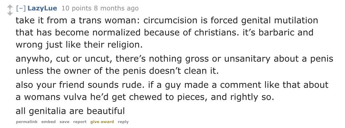 >>530093714Even trannies know circumcision is wrong and gentle mutilation.