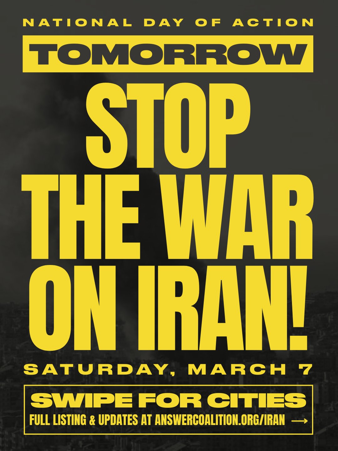 TOMORROW – 55+ CITIES TO PARTICIPATE IN THE NATIONAL DAY OF ACTION TO SAY STOP THE WAR ON IRAN!https://x.com/answercoalition/status/2029975890361266411Thousands have already been killed by the U.S. and Israel’s war on Iran—including over 150 children as they sat in their elementary school. The people of the U.S. overwhelmingly oppose the war, but that opposition needs to be expressed in the streets so it is impossible to ignore. Join a protest this Saturday, March 7, to make your voice heard!