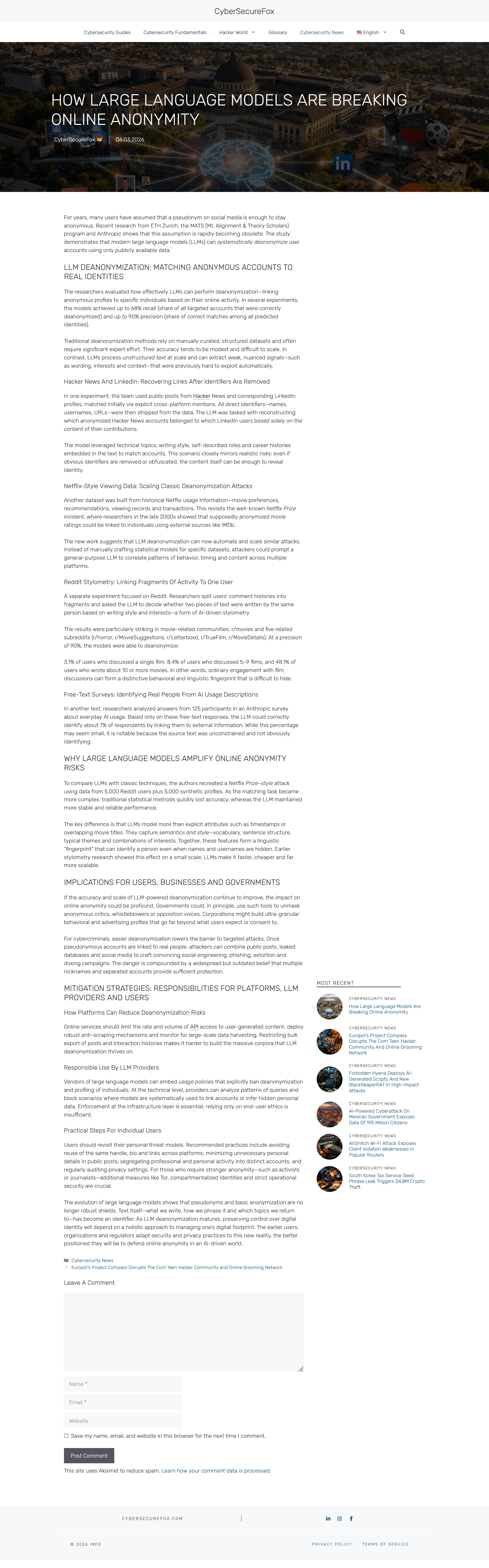 Unlike OP I will post a link and a useful one:https://cybersecurefox.com/en/llm-deanonymization-online-anonymity-risk/For 1$ they can de-anonymize you.