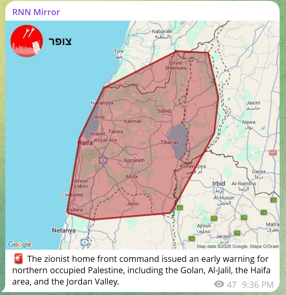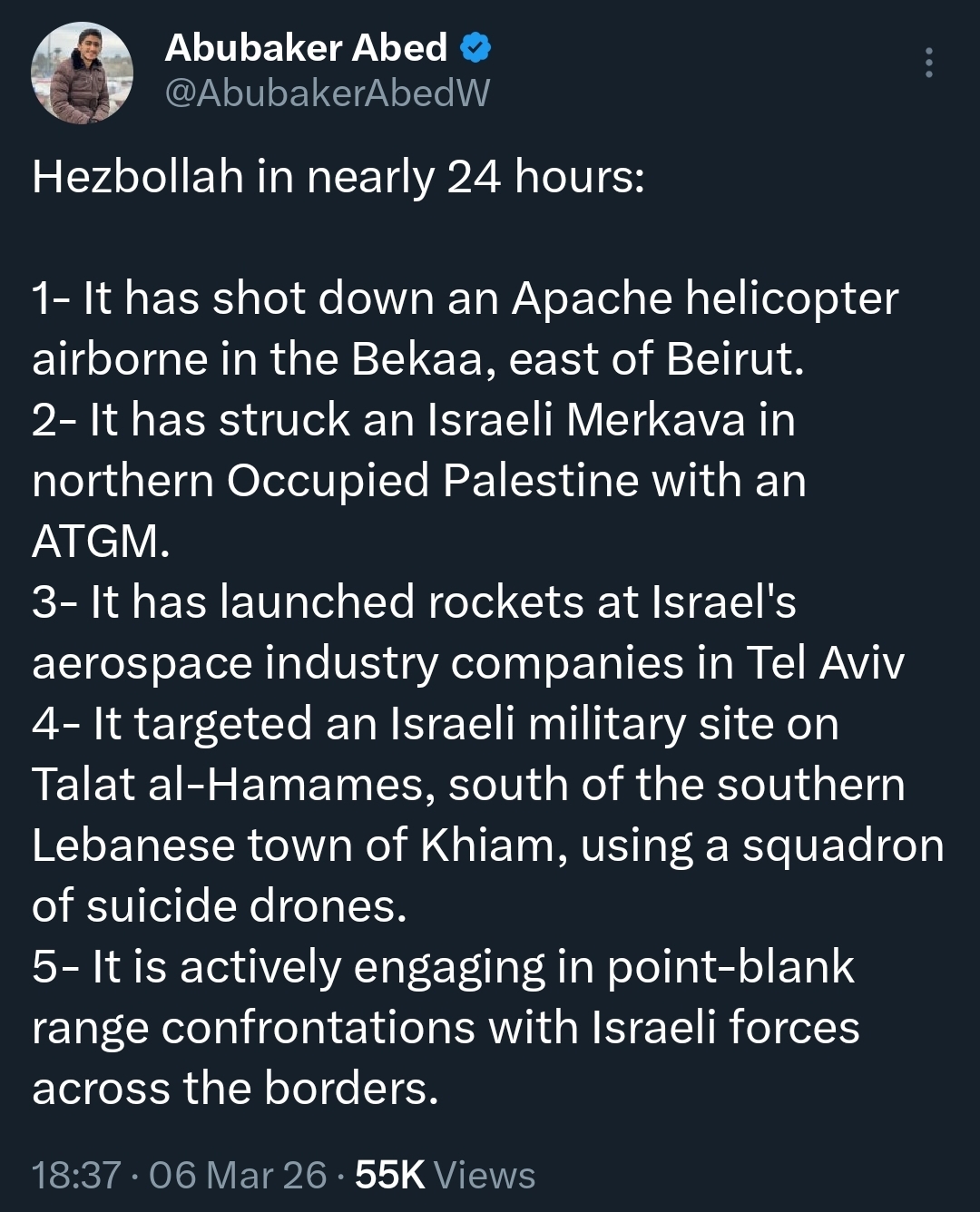 Hezbollah carried out 20 operations on March 6, 2026:>1. Targeted the Haifa naval base in the occupied city of Haifa with a rocket salvo.>2. Targeted the Yoav barracks in the occupied Syrian Golan with a rocket salvo.>3. Targeted a gathering of Israeli army vehicles at the newly established position in Markaba for the third time with a rocket salvo.>4. Targeted a gathering of Israeli army vehicls advancing towards the town of Khiam and achieving direct hits on them, forcing them to retreat.>5. Targeted the Al-Malikiya position with a rocket salvo.>6. Launched a rocket and artillery attack on Israeli army positions in various areas including the occupied Lebanese territories.>7. Launched an attack with missile salvos and artillery shells on positions and gatherings of the Israeli army in Metula, Manara, Margaliot, the Al-Ajal plateau, and the Yiftah barrack.>8. Targeted the Sasa settlement with a rocket salvo.>9. Targeted the Al-Malikiya settlement with a rocket salvo.>10. Targeted the newly established position in Blat in southern Lebanon with a swarm of attack drones and achieved direct hits.>11. Targeted the Zarait barracks with a rocket salvo.>12. Launched an aerial attack on the newly established Hamames site south of the city of Khiam with a squadron of drones.>13. Launched an aerial attack on the Jal al-Deir site with a squadron of drones.>14. Targeted the Ramot Naftali settlement with a missile salvo.>15. Targeted a gathering of Israeli forces in Kiryat Shmona with a swarm of drones.>16. Targeted Israeli forces at the newly established Markaba site with a missile salvo.>17. Launched an aerial attack on the Ami'ad base with a squadron of drones.>18. Launched an aerial attack on the Katsavia base with a squadron of drones.>19. Targeted the Shomera settlement with a missile salvo.>20. Targeted a newly established site in Balat with a guided missile, achieving a direct hit.