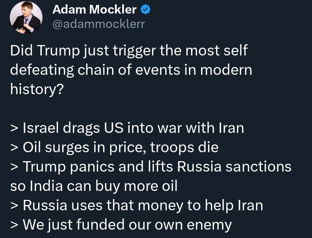 >Due to the "temporary" global oil shortage, we may lift sanctions against Russian oil — US Treasury Secretary Scott BessentLMAO